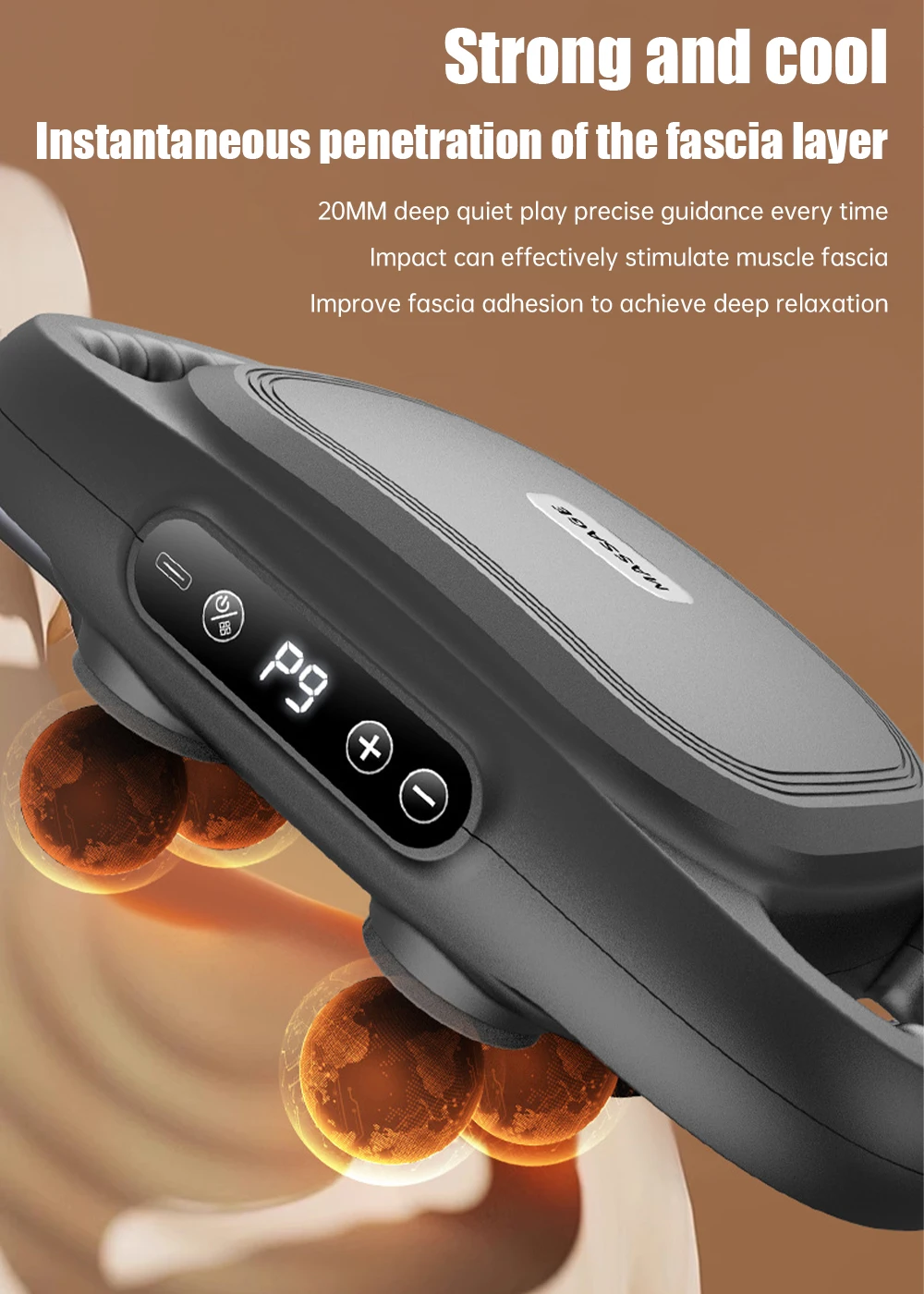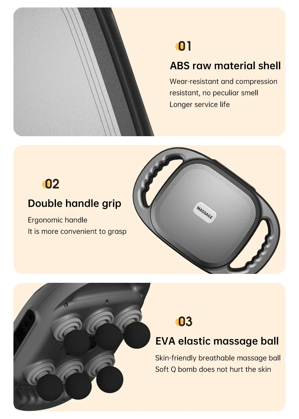 8.Detail display. ABS raw material shell, Wear-resistant and pressure-resistant, no odor, longer service life. Dual Handle Grip,ergonomic handle, more convenient to grip. EVA massage ball,self-heating massage ball, soft and Q projectile, does not harm the skin.